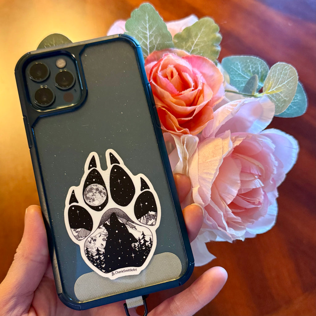 Within the curve of a single paw print lies an entire mountain wilderness. In this intricate piece, the artist pays homage to her time spent trekking the high country with her wolf-hybrid partner. To the artist, this work is a reminder that while wolves are the most gentle and loving companions, they carry the vast, relentless power of the wild within every step they take.